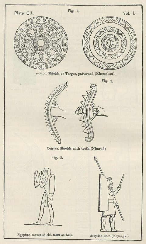 Convex shields, generally of an oblong form, were also in common use during the later period, and one kind is found in the very earliest sculptures. This is of small dimensions and of a clumsy make. Its curve is slight, and it is generally ornamented with a perpendicular row of spikes or teeth, in the centre of which we often see the head of a lion. [PLATE CII., Fig. 2.]