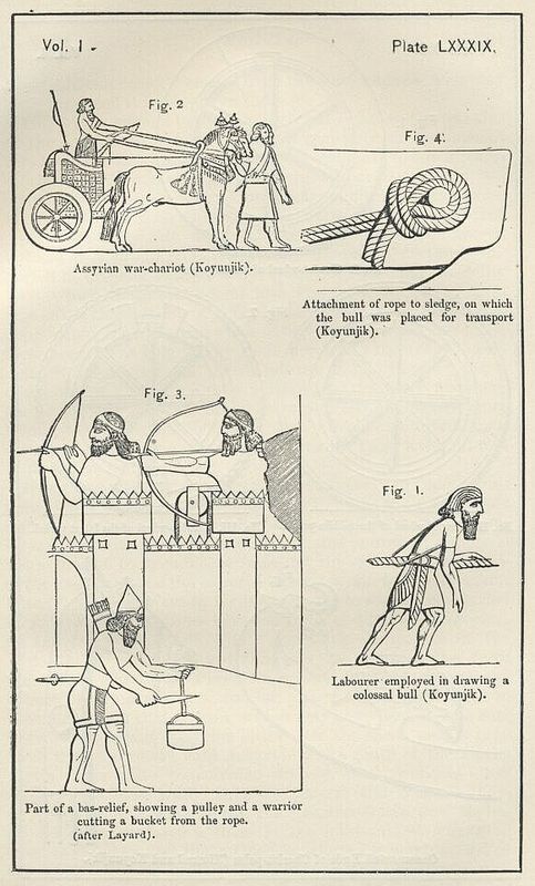 On entering the enemy's country, if a wooded tract presented itself, the corps of pioneers was thrown out in advance, and cleared away the obstructions. When a river was reached too deep to be forded, the horses were detached from the royal and other chariots by grooms and attendants; the chariots themselves were embarked upon boats and rowed across the stream; while the horses, attached by ropes to a post near the stern of the boat, swam after it. The horses of the cavalry were similarly drawn across by their riders. The troops, both cavalry and infantry, and the attendants, a very numerous body, swam the stream, generally upon inflated skins, which they placed under them, holding the neck in their left hand, and sometimes increasing the inflation as they went by applying the orifice at the top of the neck to their mouths. [PLATE CVIII., Fig. 3.] We have no direct evidence as to the mode in which the baggage of an army, which must have been very considerable, was conveyed, either along the general line of route, or when it was necessary to cross a river. We may conjecture that in the latter case it was probably placed upon rafts supported on inflated skins, such as those which conveyed stones from distant quarries to be used in the Assyrian buildings. In the former, we may perhaps assume that the conveyance was chiefly by beasts of burden, camels and asses, as the author of the book of Judith imagined. Carts may have been used to some extent; since they were certainly employed to convey back to Assyria the spoil of the conquered nations.