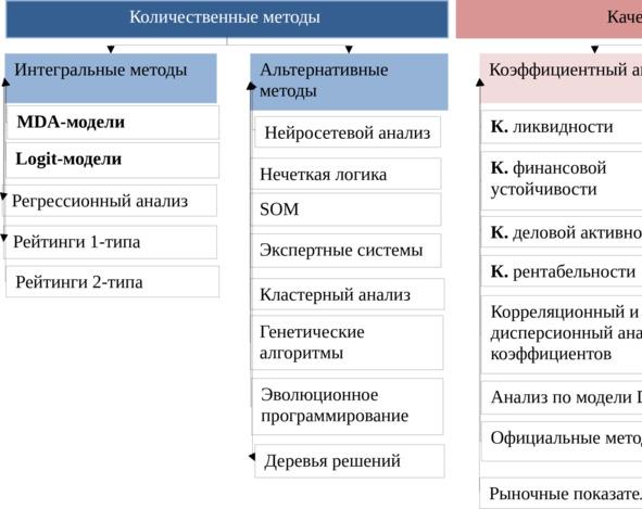 Количественные методы предполагают расчет единого интегрального показателя риска банкротства предприятия. Их можно условно разделить на две большие группы классических статистических методов и альтернативных методов. Ключевая разница между этими методами заключается в использовании различных по сложности математических аппаратов: если для классических методов, как правило, используются методы математической статистики, то в альтернативных методах используются намного более сложные методы искусственного интеллекта. По исследованиям, проведенными учеными Азизом и Дэаром, для построения моделей диагностики риска банкротства в 64% случаев используются статистические методы, в 25% искусственный интеллект, в 11% другие методы [1].