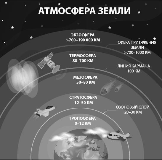 Однако если смотреть на вопрос практически, то и на высоте 100 км атмосфера не заканчивается. Физики говорят, что переход атмосферы в межпланетное пространство постепенно происходит в экзосфере – области, которая простирается на 190 тысяч километров, половина расстояния до Луны! Получается, что спутники и Международная космическая станция всё еще находятся в атмосфере – в ее высших разреженных слоях. И это правда: любой околоземный объект потихоньку тормозится под воздействием разреженных газов. Раньше или позже он войдет в более плотные слои и сгорит. Чтобы сохранить орбиту Международной космической станции, ее необходимо «корректировать», то есть поднимать высоту с помощью двигателей.