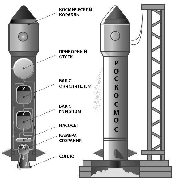 Ракетное топливо обычно состоит из горючего и окислителя. Чтобы они случайно не смешались и не воспламенились, их баки отделены друг от друга. Кроме того, важно сделать так, чтобы горючее и окислитель непрерывно шли в двигатель, в камеру сгорания. И чем больше будет давление в этой камере, тем больше будет эффективность двигателя, тем дальше и выше ракета полетит. На первых ракетах с жидким топливом, которые появились еще в 1930-е годы, применяли вытеснительную подачу топлива – из особого бака поступал азот под давлением и вытеснял компоненты топлива, направляя их в камеру сгорания. Но такие двигатели обладали невысокой тягой и эффективностью, то есть не использовали полностью запас энергии, содержащийся в топливе. Сегодня используется турбонасосный агрегат – турбина приводит в действие насосы, которые прокачивают компоненты топлива.