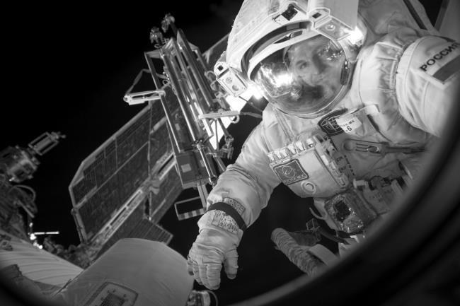 Сергей Рязанский работает в открытом космосе (фотография Джека Фишера)