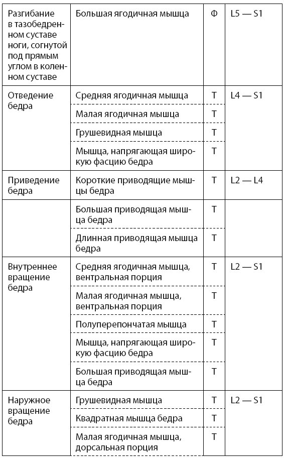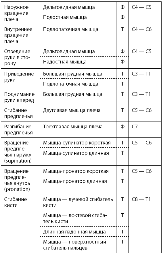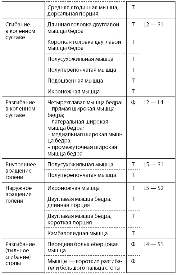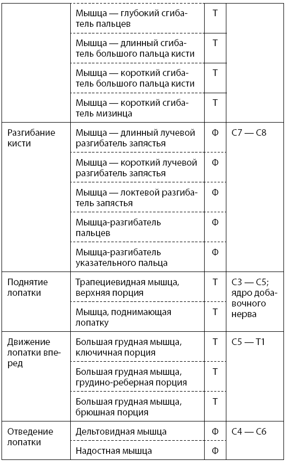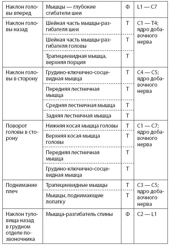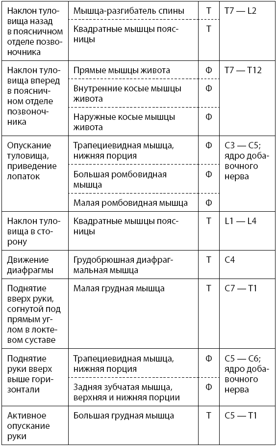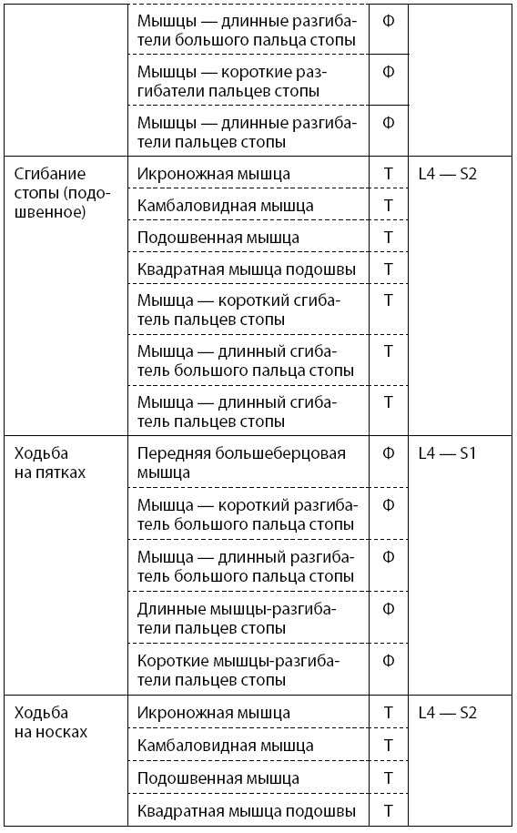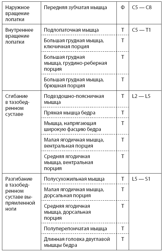 Основные двигательные функции человека, уровни сегментарной иннервации спинного мозга и участие в них тонических и фазических мышц представлены в табл. 1.1 (тонические мышцы обозначаются буквой Т, а фазические – Ф).