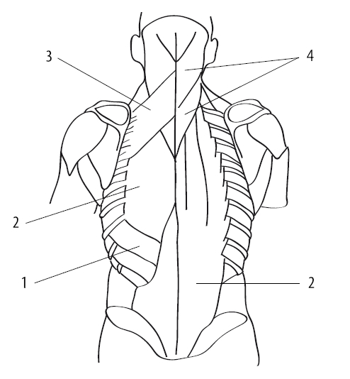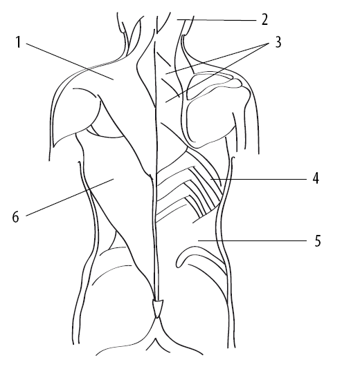 Рис. 1.1. Поверхностные мышцы спины: 1 – трапециевидная мышца; 2 – ременная мышца головы; 3 – большая и малая ромбовидные мышцы; 4 – задняя зубчатая мышца; 5 – пояснично-грудная фасция; 6 – широчайшая мышца спины
