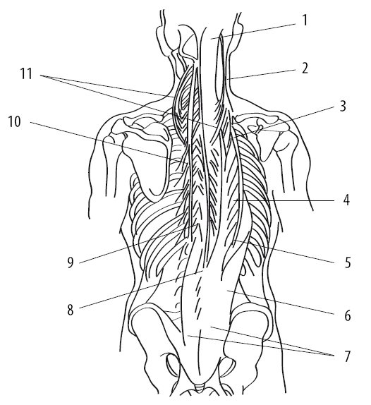 Рис. 1.3. Глубокие мышцы спины (справа показан разгибатель спины, слева – поперечно-остистая мышца): 1 – полуостистая мышца головы; 2 – длиннейшая мышца головы; 3 – подвздошно-реберная мышца шеи; 4 – длиннейшая мышца груди; 5 – подвздошно-реберная мышца груди; 6 – подвздошно-реберная мышца поясницы; 7 – мышца, разгибающая позвоночник (до разделения); 8 – остистая мышца груди; 9 – полуостистая мышца груди; 10 – полуостистая мышца шеи; 11 – длиннейшая мышца шеи