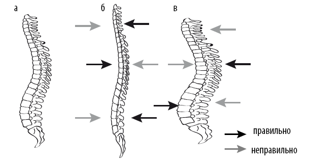 При увеличении физиологических изгибов необходимо исключить из систематических занятий оздоровительной гимнастикой (рис. 1, в):