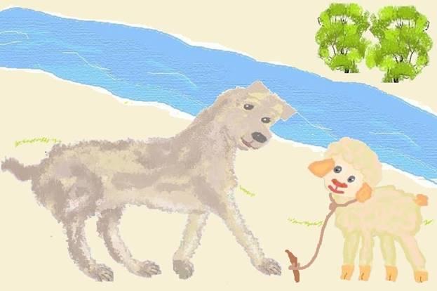 Недалеко був брід, вовк кинувся до нього, щоб перебратися на інший берег річки. Барбос хотів його переслідувати, поки не зловить, але раптово він почув на березі: «Бе-бе! Спасі-і-іть! Бе-бе!». Барбос зупинився і подивився, хто кличе на допомогу. На березі стояло прив'язане до кілочка маленьке ягня.