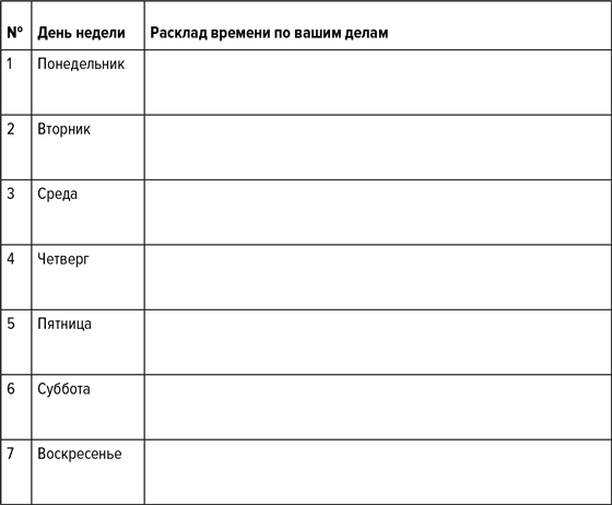 Напишите расклад своего времени на неделю. Занесите в таблицу по дням запланированные дела, указав, что делаете утром, в обед и вечером. Если не планируете дни, напишите — не планирую, не помню, что обычно делаю.