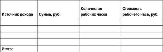 Давайте посчитаем стоимость вашего рабочего часа. Заполните таблицу, указав вашу сумму денег по всем своим источникам дохода (заработная плата, аренда, дивиденды и т.п.), а также сколько времени вы на это тратите.