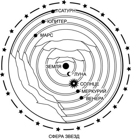 По системе Аристотеля, в центре Мира находится неподвижная Земля. Земной шар окружен сферами из Воды, Воздуха и Огня. Далее вращаются прозрачные («хрустальные») небесные сферы, на которых неподвижно закреплены Луна, Меркурий, Венера, Солнце, Марс, Юпитер и Сатурн. Эти сферы назывались также «небесами» – «Небо Луны», «Небо Солнца», «Небо Венеры» и т. д. За «Небом Сатурна» находится последняя сфера – «Небо неподвижных звезд». А за ним – «Перводвигатель», приводящий всю мировую систему в движение.