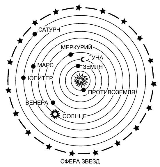 Интересно, что один из учеников Пифагора, Филолай, тогда еще предложил свой вариант строения Мира, отличающийся от гипотезы учителя. Он утверждал, что в центре всех сфер находится не Земля, а некий центральный огонь, который дает свет и тепло всем другим небесным телам. Земля, как и все планеты, вращается со своей сферой вокруг этого огня. К известным тогда планетам Филолай добавил еще и «противоземлю», которая находилась на своей сфере ближе всех к центральному огню, но всегда напротив Земли и поэтому не видна. Солнце тоже вращается вокруг огня, но в отличие от планет своей гладкой блестящей поверхностью отражает его свет, передавая планетам. Система Филолая не нашла признания ученых коллег. А ведь он был ближе к истине, несмотря даже на этот странный «центральный огонь» вместо Солнца…