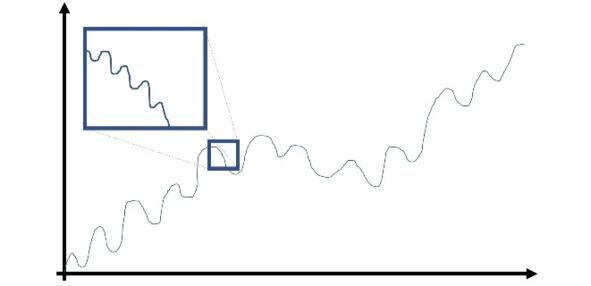 Если брать конкретный эпизод, запечатлённый в квадрате, то может показаться, что всё идёт на спад, однако общая тенденция всего графика, как вы уже успели заметить, идёт на рост, и это не всегда очевидно. Если брать квадрат, который отражает спад и равен продолжительности жизни человека, то в нём тоже есть волнообразные явления, которые для конкретного промежутка времени выглядят так, как будто вот-вот начнётся рост, н