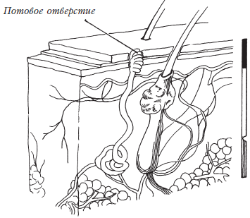 К волосяному фолликулу примыкают 2–3 сальные железы, потовая железа, мышца, которая поднимает волос, а также кровеносные сосуды и нервные волокна.