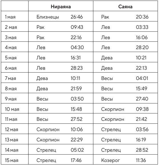 Обратите внимание на цифры в Таблице 1. Они говорят о том, что примерно через два дня Луна достигает того же градуса по системе нираяна, как и по системе саяна. Например, 3 мая она находилась в 16 градусе Льва по системе саяна, а 5 мая – по системе нираяна.