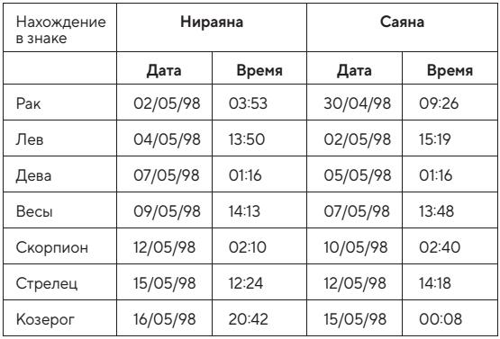 В Таблице 1 представлены координаты Луны в первой половине мая 1998 года по системе саяна и нираяна.