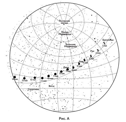 Когда Солнце находится в небе, наблюдать за звездами практически невозможно. В течение мая по ночам на небе не должно быть видно ни одной планеты. Поэтому мы приводим положение Луны, за которой мы могли наблюдать каждую ночь в мае 1998 года.