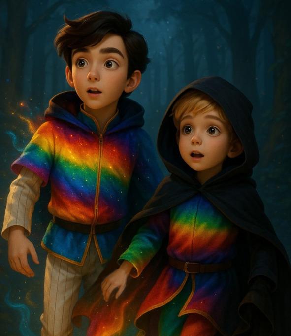 Они начали замечать, что с каждым шагом их одежда словно оживала, меняясь с молниеносной скоростью. То они были в уютных домашних пижамах, словно дома, а вот — уже в ярких костюмах, переливающихся всеми цветами радуги. В следующую секунду их укрывал тёмный плащ, скрывающий лица, будто они были героями таинственной легенды.
