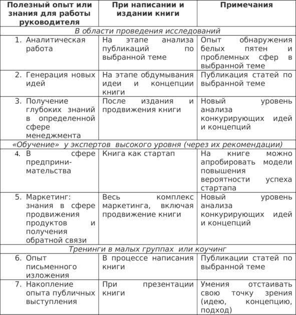 Ниже представлена таблица, где я представляю знания и опыт, которые руководитель может получить, если для получения управленческих знаний выберет альтернативный получению степени DBA вариант — написание и издание своей книги.