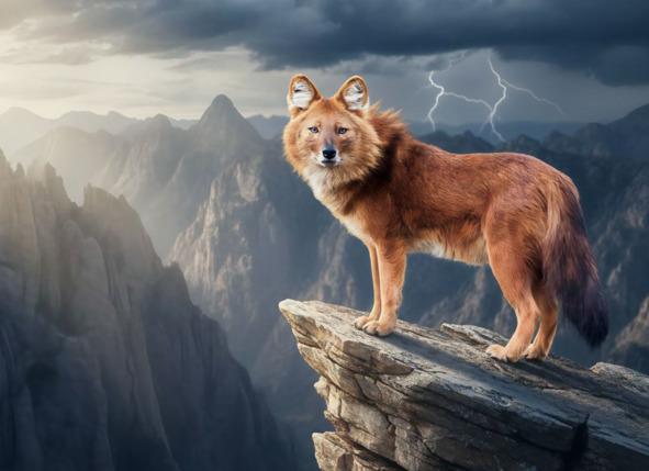 Он — сплав огня и тени, живое пламя, бегущее по горным склонам. Взгляните на него: он меньше серого волка, но в его жилах течет та же древняя сила. Его тело, чуть больше метра в длину, кажется коротким и сбитым, но оно создано для неутомимой погони. Шерсть его — густая, длинная, цвета осеннего леса и заката — могла бы принадлежать лисице, как и роскошный, пушистый хвост, что следует за ним рыжим шлейфом. Но его голова — это голова волка. Лобастая, мощная, с большими, чуткими ушами, улавливающими малейший шорох, и узкой, почти лисьей мордой, в которой горит умный и дикий взгляд.