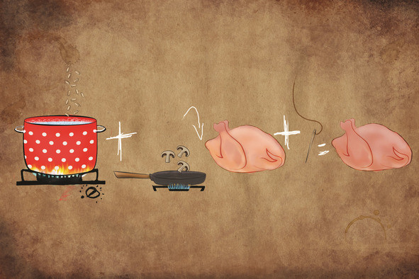 Начала я с приготовления курицы. Вымыла ее, как положено, добавила специй, порезала лук и морковку и благополучно спалила ее на сковородке.