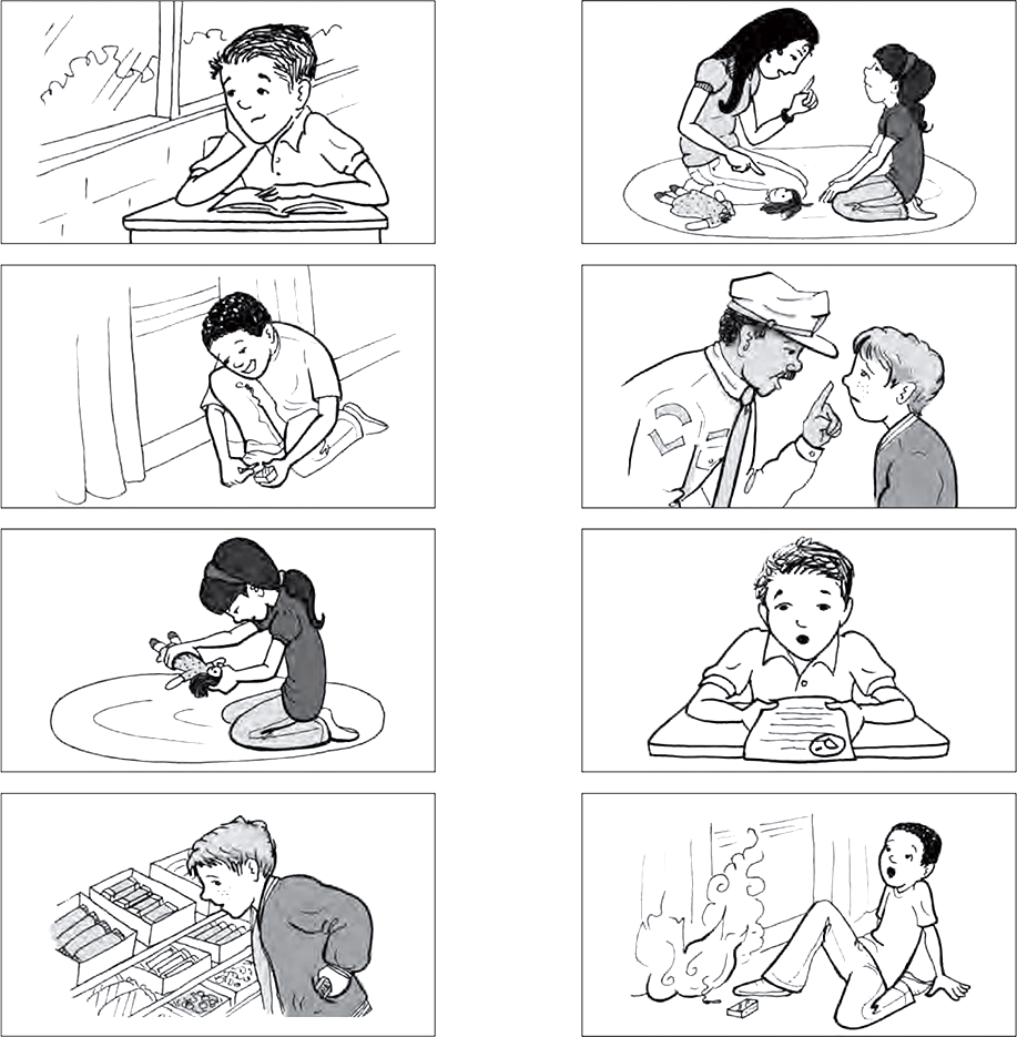 Можешь ли ты угадать, какие последствия ждут ребят из левой колонки? Проведи линию от каждой картинки слева к той картинке справа, на которой показано, к чему могут привести их действия.