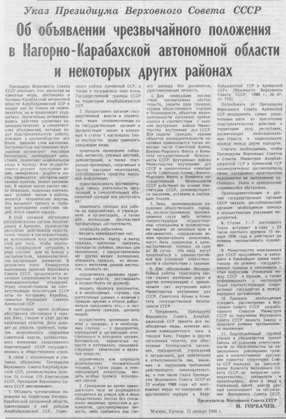 После ядерной катастрофы в Чернобыле, спитакской трагедии, мощных взрывов объектов транспортной инфраструктуры в Арзамасе, Свердловске, Уфе и в других местах, с началом широкомасштабных межнациональных столкновений в Нагорном Карабахе и других регионах обходиться лишь привычным правовым инструментарием, заложенным в Конституции СССР 1977 года и в построенных на ее основе законах, уже было просто немыслимым. Поэтому и потерпели полный крах искусственные, изначально нежизнеспособные юридические формулы вроде «введения особого порядка управления» по типу Комитета Особого Управления Нагорно-Карабахской автономной областью в составе восьми человек под председательством А.И.Вольского. Потребовался дополнительный Указ Президиума Верховного Совета СССР от 15 января 1990 года №1060-I «Об объявлении чрезвычайного положения в Нагорно-Карабахской автономной области и некоторых других районах». Толку, правда, от этой очередной горбачевской пустышки было мало — явно не хватало, так сейчас стало модным говорить, должной «имплементации» (т.е. конкретных организационно-правовых механизмов исполнения) этого нормативного акта…