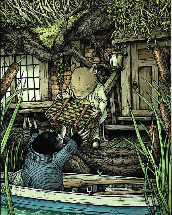 Привязав лодку к кольцу на причале, Крыс забрался в свою нору и вскоре вылез оттуда, пошатываясь под тяжестью плотно набитой корзинки с провизией. Передавая её Кроту, Крыс попросил: