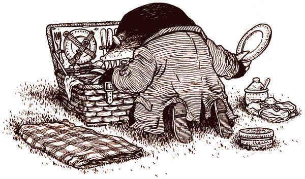 Распаковывать корзинку было гораздо приятнее, чем собирать грязную посуду и остатки трапезы, однако Крот, настроенный только на положительные эмоции, смело принялся за дело. Уже упаковав и крепко перевязав корзинку, он обнаружил в траве ну просто таращившуюся на него тарелку. Пришлось снова всё развязывать, а когда и она была упакована, Крыс указал на вилку, лежавшую на самом виду. Когда и вилка отправилась в корзинку и все ремешки были затянуты, оказалось (вот ведь незадача!), что он сидит на горчичнице. И всё же Кроту наконец удалось справиться с этой задачей.