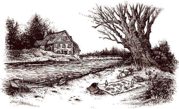 Прибрежная заводь, куда Крыс направил лодку, выглядела как маленькое озерцо. Там к реке спускался пологий травянистый берег, сквозь зеркальную гладь воды проглядывали похожие на змей коричневые корни деревьев, а впереди виднелся серебристо-пенный каскад плотины, мельница с остроконечной крышей и мельничное колесо, наполнявшее воздух умиротворяющим монотонным гулом, в который изредка вплетались чьи-то весёлые голоса. Это было так красиво, что от избытка чувств Крот всплеснул передними лапками и воскликнул: