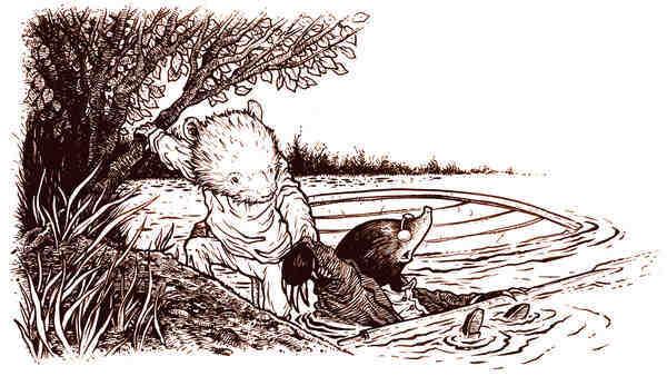 Подавленный и пристыженный, Крот трусил вдоль берега, пока Крыс снова и снова нырял в реку, переворачивал и привязывал лодку, ловил в воде вещи, доставал со дна корзинку, а потом пытался забраться с ней на берег.