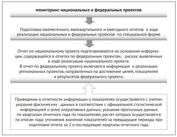 На основе данных отчетов по реализации федеральных проектов, руководитель соответствующего национального проекта выстраивает подготовку отчета по национальному проекту и представляет отчет в проектный офис Правительства РФ и в Министерство экономического развития Российской Федерации, которое готовит соответствующее заключение.