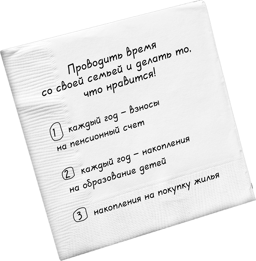 Мне попался на глаза маркер и блок бумаги на принтере, я взял их и просто записал три-четыре пункта, действительно важных для нас. Первый отвечал на вопрос «Зачем?» – «Зачем нам нужны деньги, почему это важно?» Получилась своего рода формулировка наших ценностей как напоминание о том, зачем мы усердно работаем и копим деньги.