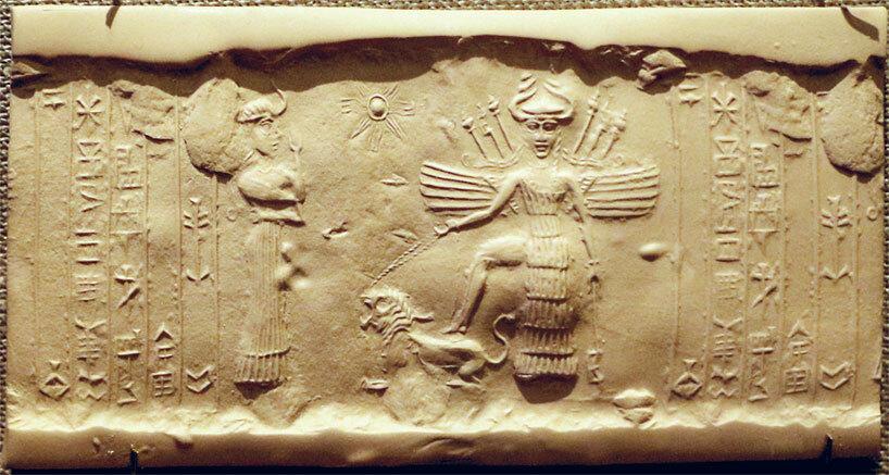 Печать Инанны. Аккадская цилиндрическая печать, изображающая богиню Инанну, положившую ногу на спину льва, в то время как ее визирь Ниншубура стоит перед ней, выражая почтение, около 2334–2154 годов до н. э. Институт Востока Чикагского университета