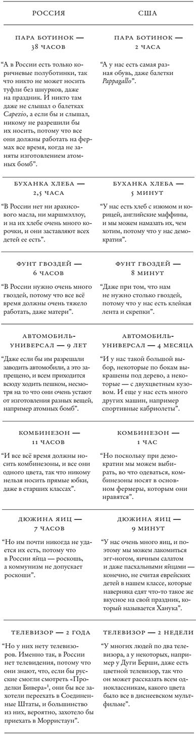 В числе множества изобретений, призванных поддерживать в нас это убеждение, была подробная таблица, ежегодно воспроизводившаяся в наших учебниках по обществознанию. Эта таблица наглядно показывала тяжкие экономические проблемы коммунистической жизни. Таблица зачитывалась вслух, причем чтение сопровождалось построчными комментариями учительницы и гласила приблизительно следующее: