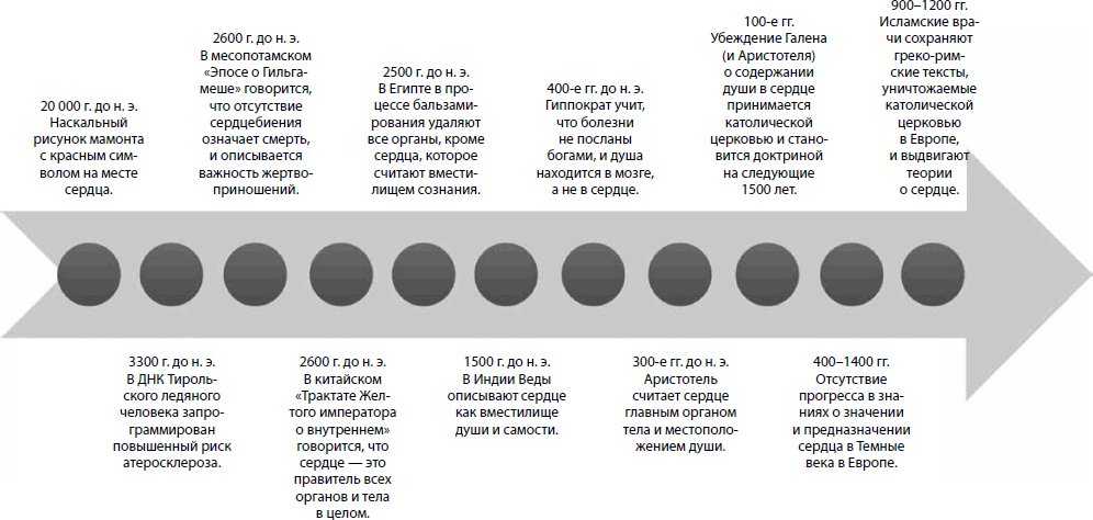 Я изучил, как соперничество между сердцем и мозгом привело к осмыслению связи этих двух органов. В этой книге я опишу эволюцию восприятия сердца с зари человеческой цивилизации (20 тысяч лет назад; см. схемы 0.1–0.3) до сегодняшнего дня. Я расскажу, как менялись представления о его предназначении и как это влияет на понимание жизненных сил, сосредоточенных внутри него. Почему мы всегда считали, что именно сердце является центром нашего тела (который в действительности расположен под пупком, рядом с крестцом)?