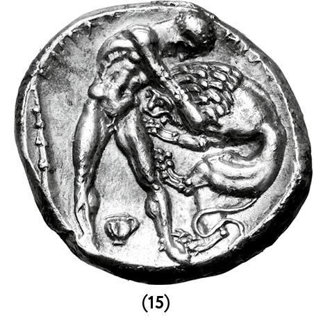 Тема схватки Геракла с Немейским львом привлекала и мастеров, работавших с другими изобразительными средствами. Например, на серебряной монете IV века до н. э. из Гераклеи в Лукании на юге Италии (ил. 15) Геракл как будто состязается со львом в единоборстве. Он поймал льва в шейный захват, как делают борцы, тем самым у схватки возникает антропоморфный подтекст, всё больше набиравший популярность. Палица Геракла опирается в левую грань монеты, размерами она с дубинку, которая ассоциируется скорее с атрибутом Тесея (см. ил. 11). В сценах сражения с Немейским львом на Геракле, как правило, нет львиной шкуры, потому что она еще на звере, — но иногда по рассеянности художник, привыкший видеть героя, облаченным в львиную шкуру, упускал нить сюжета. Этот тип батального сюжета был чрезвычайно популярен с середины V века до н. э. и воспроизводился в малой бронзовой и большой мраморной скульптурах, а также на резных мраморных саркофагах, которые римляне часто украшали сценами из мифов.