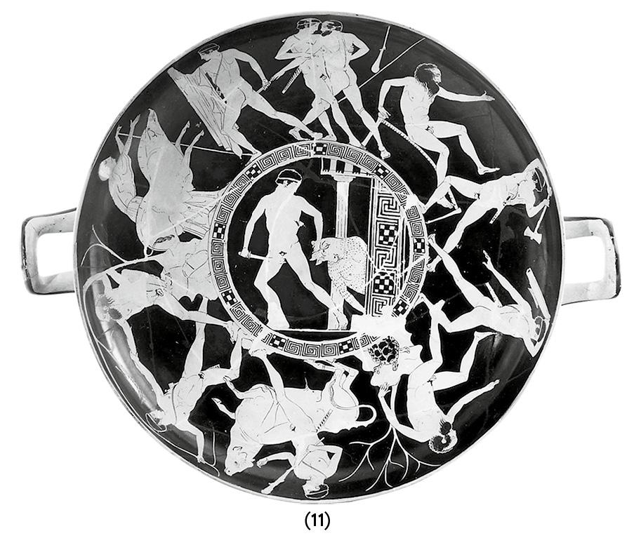 В центре краснофигурной чаши (ил. 11) Тесей изображен уже после своего триумфа над Минотавром, он вытаскивает убитого монстра из лабиринта, где тот был заточен. Центральное изображение обрамляют сцены, на которых предстают не только победы Тесея над разными безжалостными злодеями и чудовищами, но и способы, какими он их побеждал. А побеждал он преступников всякий раз их же уловками. Так (в верхней части), Тесей схватился с Керкионом, который заставлял странников бороться с ним до смерти. Далее по часовой стрелке (на два часа) он «подгоняет» тело Прокруста под размеры его ложа, отрубая выступающие конечности топором, как поступал с путниками и сам Прокруст. Еще ниже (на четыре часа) Тесей сбрасывает со скалы Скирона, отправляя его на съедение черепахе. Скирон развлекался тем, что принуждал путешественников мыть ему ноги на краю обрыва, а затем сталкивал их вниз — в качестве лакомства черепахи. В следующей сцене (на восемь часов, шесть часов пока пропускаем) Тесей расправляется с Синидом, привязав его к верхушкам двух пригнутых к земле деревьев, которые он потом отпустит, в точности так, как проделывал со своими жертвами Синид. В последнем сюжете (на десять часов) он убивает свинью, которая нападала на людей и уничтожала посевы в окрестностях Кроммиона.