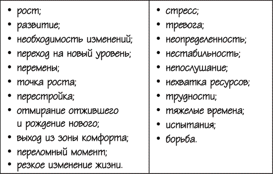 С левой стороны я расположила ассоциации с нейтральным или позитивным смыслом, с правой – негативные. Обратите внимание, количество и тех и других примерно одинаково. В этом вся суть кризиса: местами это может быть неприятно, но совершенно необходимо и открывает новые возможности. Кстати, в японском языке слово «кризис» состоит из двух иероглифов: «разрушение» и «шанс», то есть разрушение дает нам новый шанс.