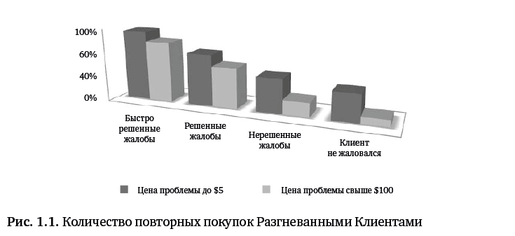 - Цена, которую компания платит за некачественную работу с Разгневанным Клиентом, настолько высока, что может стоить ей жизни в прямом смысле слова. Согласно данным, полученным организацией TARP в результате исследования «Как много ваших разочарованных покупателей купят у вас снова» [1], в случае быстрого и исключительно позитивного подхода к решению проблемы Клиента вернутся за повторной покупкой 95% из них. При этом из тех, кто ни на что не жаловался, обратно придут только 37% Клиентов. Если же в результате возникшей проблемы «молчуны» потеряют значительную сумму, то таких у компании останется всего 9% (рис. 1.1).