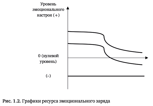 Нижний (горизонтальный) график демонстрирует эмоциональный уровень негативно настроенного человека и находится в отрицательной зоне. Изначальное негативное отношение к чему-либо не позволяет даже приступить к делу. Вы наверняка сталкивались в жизни с ситуациями, когда отказывались сделать попытку, считая ее бессмысленной. Вы говорили себе: «Все равно из этого ничего не выйдет», или «Нет смысла рассказывать, он (она) даже слушать не станет», или «Продать невозможно, потому что это никому не нужно». Человек, настроенный подобным образом, сразу отходит прочь. Возможно, вы сами бывали в роли разочарованного Клиента, получив опыт встречи с похожим представителем компании. Уверен, что та компания потеряла вас навсегда.
