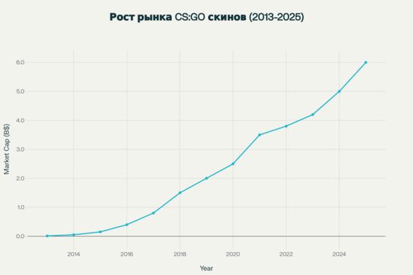 График демонстрирует взрывной рост рынка скинов CS: GO с $10 млн в 2013 году до $6 млрд в 2025 году, параллельно с ростом аудитории игры