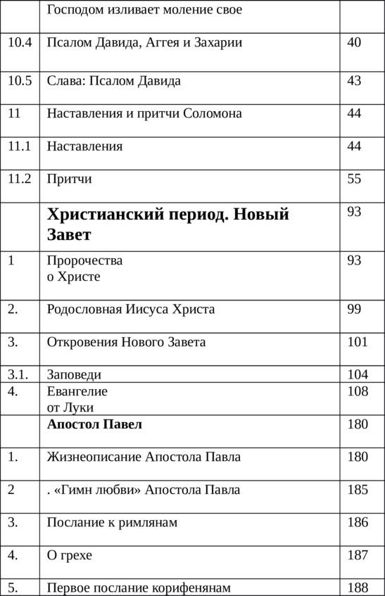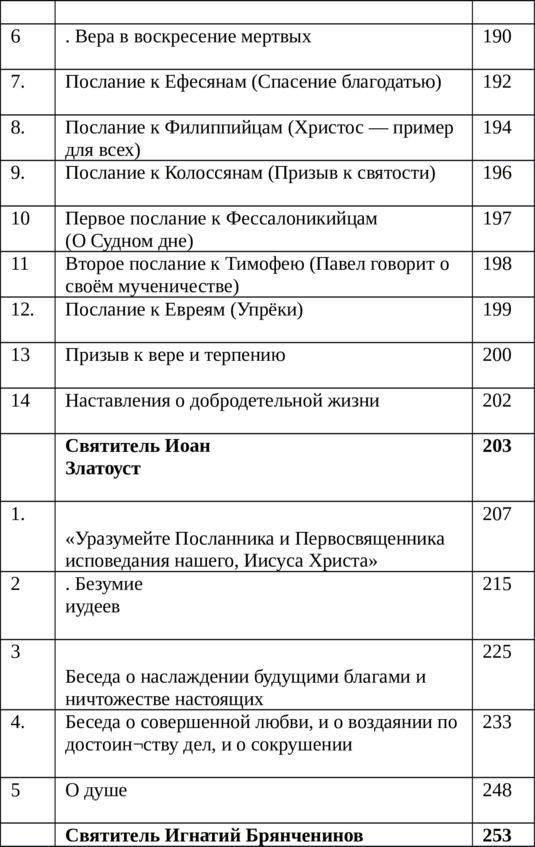Далее читатель узнает о пророчествах о Иисусе Христе в древние времена, о его родословной и заповедях Нового Завета. Здесь же представлено одно из четырех Евангелий — Евангелие от Луки. Далее любознательный читатель познакомится с жизнеописанием и основными трудами великих подвижников христианства: Апостола Павла, Святителей Иоана Златоуста и Игнатия Брянченинова.
