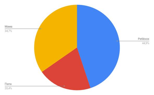 Некоторые девушки сказали, что им тяжело распределить в процентах. Но большинство всё-таки ответили на этот вопрос, не заподозрив подвоха. К моей радости, некоторые мамочки считают так: «Если я не буду любить себя, то почему меня должен любить муж? К нам относятся ровно так, как мы позволяем к себе относиться». В книге я доказываю эту позицию. И всё же среднее значение вы видите на диаграмме. Больший процент получает ребёнок (дети), затем мама, и папе достается меньше всех.