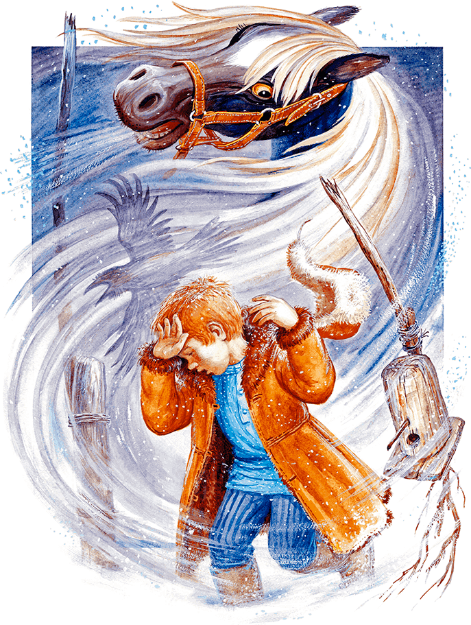 Слеза скатилась у коня из глаз. Конь заржал жалобно, протяжно, взмахнул хвостом, и тотчас в голых деревьях, в изгородях и печных трубах завыл, засвистел пронзительный ветер, вздул снег, запорошил Фильке горло. Филька бросился обратно в дом, но никак не мог найти крыльца – так уже мело кругом и хлестало в глаза. Летела по ветру мёрзлая солома с крыш, ломались скворечни, хлопали оторванные ставни И всё выше взвивались столбы снежной пыли с окрестных полей, неслись на деревню, шурша, крутясь, перегоняя друг друга.