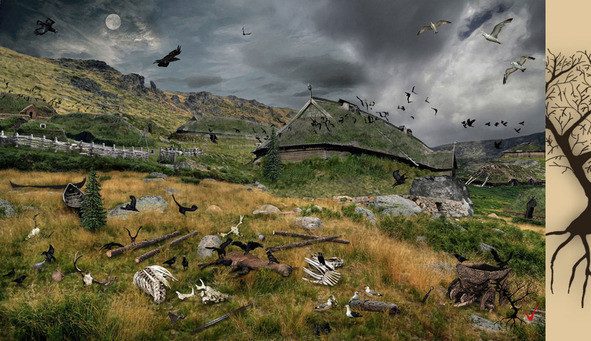 Мы прошли к середине захоронения, где возвышался каменистый холм. На нем раскинулось дерево с ветром искалеченными ветвями. Под деревом лежал скелет воина и какого-то животного. Приглядевшись, я увидела, что это лошадь, а скелет — женщины-воина. Воительница была лучницей, рядом с ней лежал огромный тугой лук украшенный фигурками богов Ньерда и Фрейи из золота, любила море она… Была на ней кольчуга и шлем с рогами, которые обвивало неясное растение из серебра. Погибла она видимо от вражеских стрел — из ее груди торчали две большие тяжелые стрелы с черными наконечниками. Ее верный конь, наверное, убит был или пал от тоски, не предав своей погибшей хозяйки…