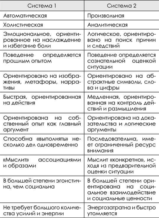 Подводя итоги в рамках данной работы о разделении нашего мышления на две системы как ключевого тренда оценки поведения, представим следующую условную таблицу: