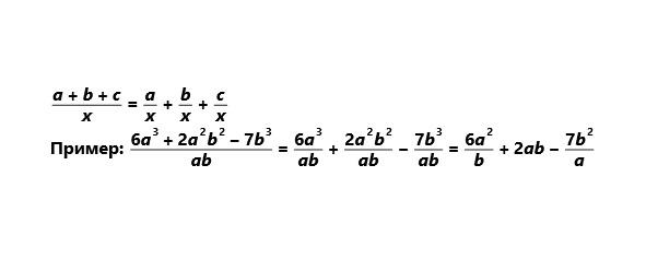 Частное от деления многочлена на одночлен равно сумме частных, полученных от деления каждого слагаемого многочлена на одночлен.