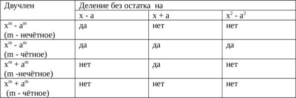 Среди частных случаев деления многочлена на многочлен выделим делимость двучлена xm±am на x±a.