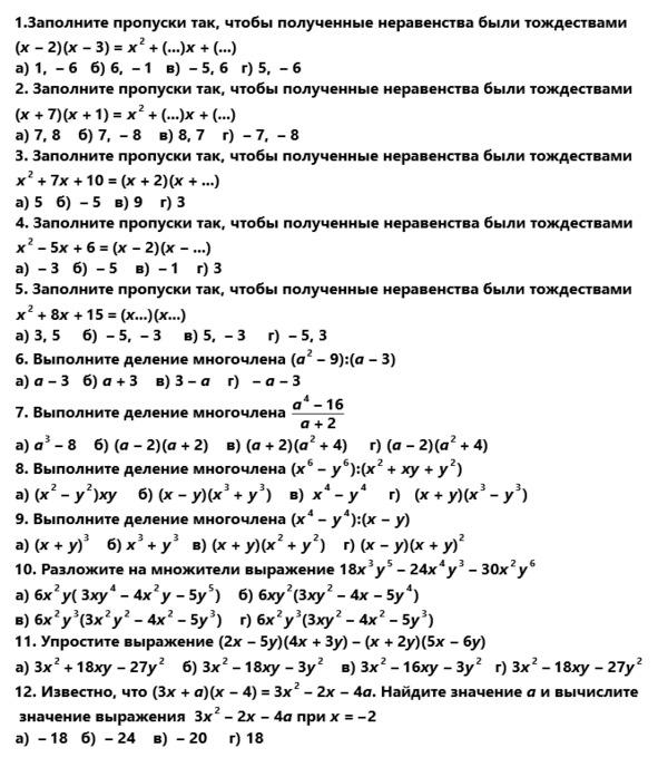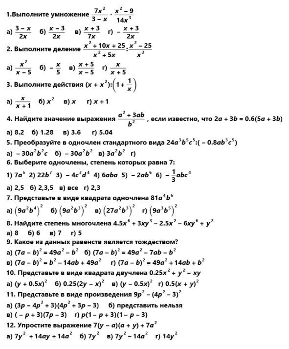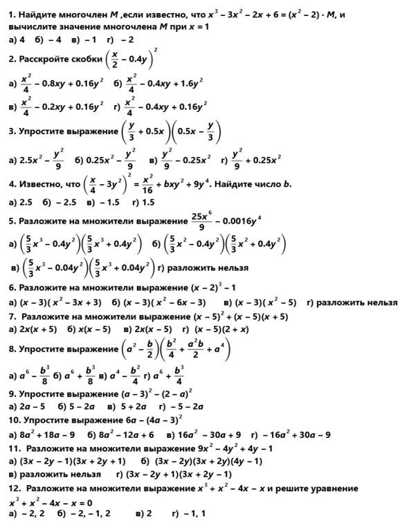 Одночлен. Многочлен. Преобразование алгебраических выражений. Формулы сокращённого умножения. Разложение многочлена на множители