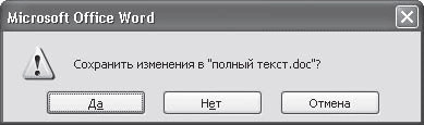 Если на момент закрытия в программе открыты файлы, изменения в которых не были сохранены, перед тем как завершить работу, программа попросит вас сохранить изменения. При выполнении одной из операций закрытия на экране появится окно Сохранить изменения в «название_документа»? (рис. 1.18). Для подтверждения сохранения изменений нужно нажать кнопку Да, для отклонения – кнопку Нет. Чтобы вернуться к документу и продолжить работу с ним, следует щелкнуть на кнопке Отмена.